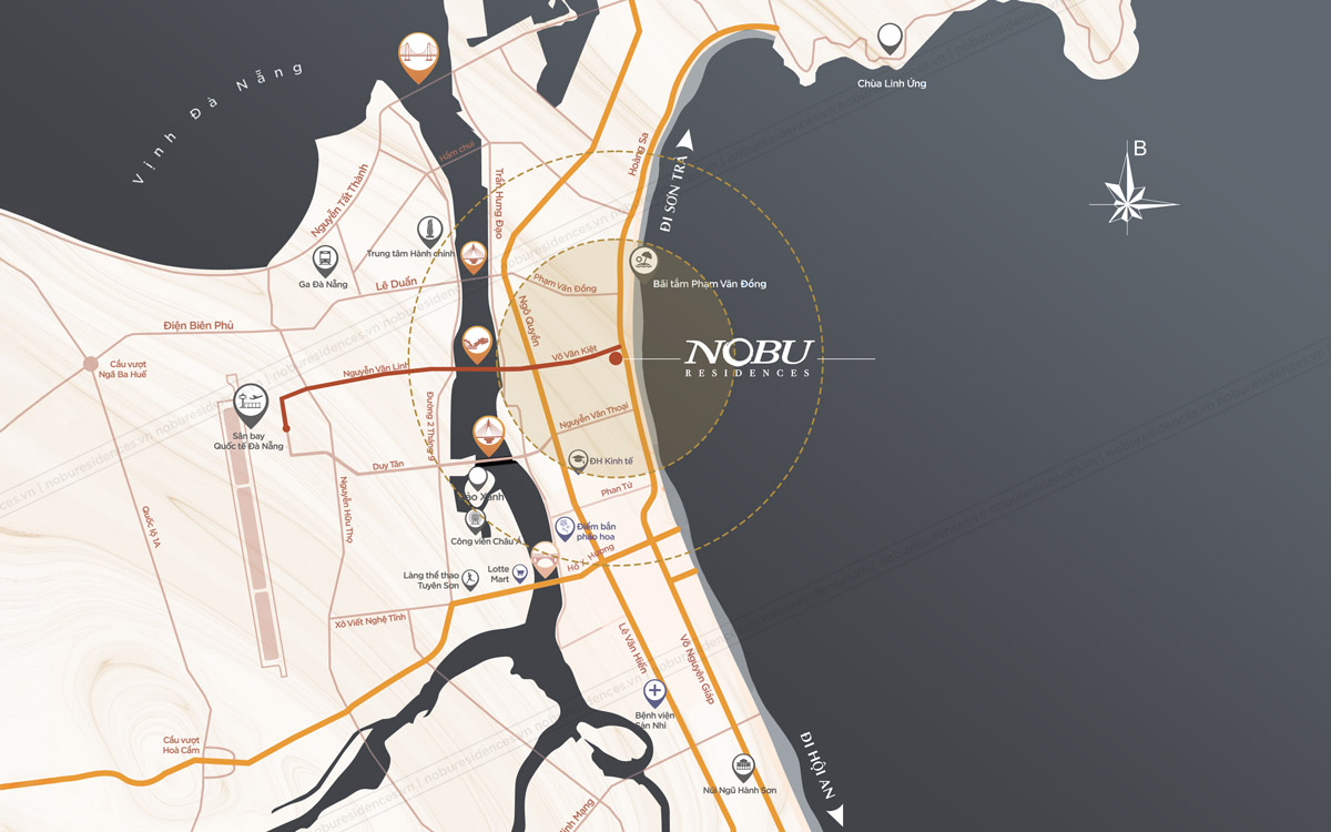 Một trong những điểm mạnh nổi bật của Nobu Residences Danang chính là vị trí nằm tại giao lộ của hai tuyến đường huyết mạch – đại lộ Võ Nguyên Giáp và Võ Văn Kiệt.